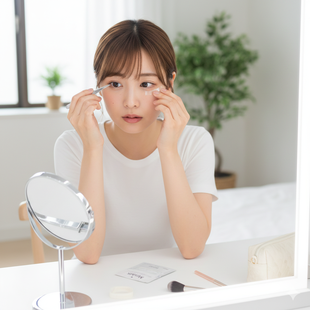 眉や軽いコンシーラーを使ってトータルバランスを整えると、目元だけ浮かず自然に見えます。ニキビや赤みも薄く隠すと印象アップ。